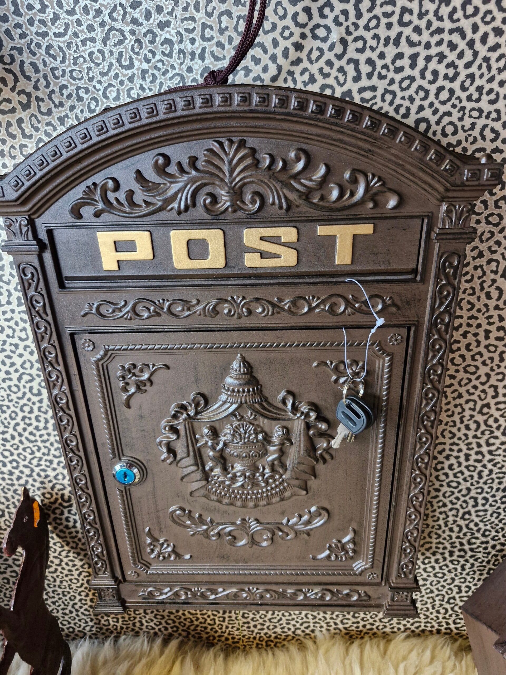 Bruine brievenbus met 2 sleutels.